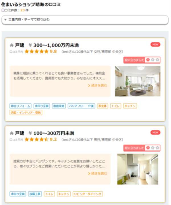 Step 1 次の公式リンクから 株式会社トップリフォーム評判 の最新の結果を入手してください。 Step 2 あなたが必要とする情報を得るために詳細を見るためにクリックしてください。 Step 3 株式会社トップリフォーム評判の結果を得ていない場合は、ホーム リフォーム評価ナビの5つの特徴 1.財団による公正・中立なサイト運営 リフォーム評価ナビでは、工事終了後に「口コミ」による評価を、お客様が直接財団に投稿できる場を設けています。 お客様の「満足のいくリフォームをしたい」という想い。 本日は『リフォーム評価ナビ』というサイトを紹介させて頂きます。 このサイトは、リフォームをご検討中の「住まい手」と、リフォームを手がける「作り手」を 口コミ でつなぐリフォームポータルサイトです。 地域の事業者探しに役立つ情報はもちろん、将来のリフォームのために